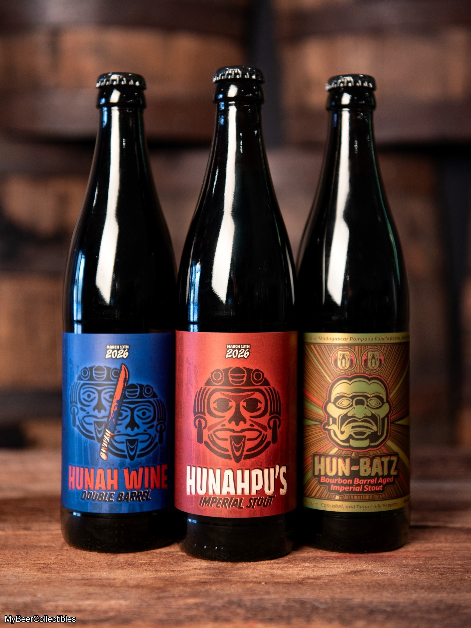 Hun-Batz: Bourbon Barrel Aged Imperial Stout with Ceylon Cinnamon, Comoros & Madagascar Pompona Vanilla Beans, Vanilla Caviar, Ghana, Fiji & Criolloa Cacao nibs, and Aji Amarillo, Pequin, Cascabel, and Puya Chile Peppers