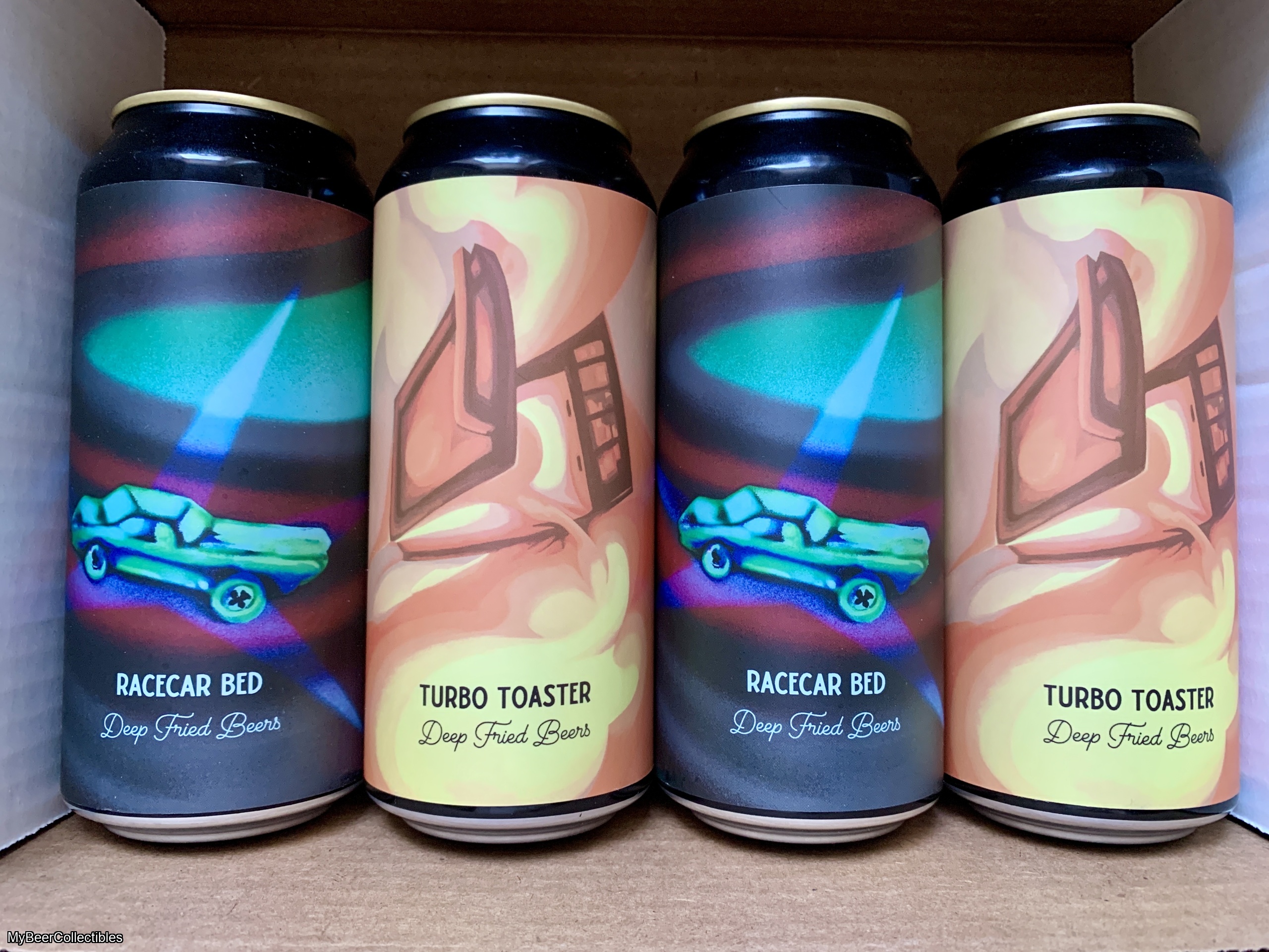 Four Deep Fried Beers cans, featuring two each of Turbo Toaster and Racecar Bed.