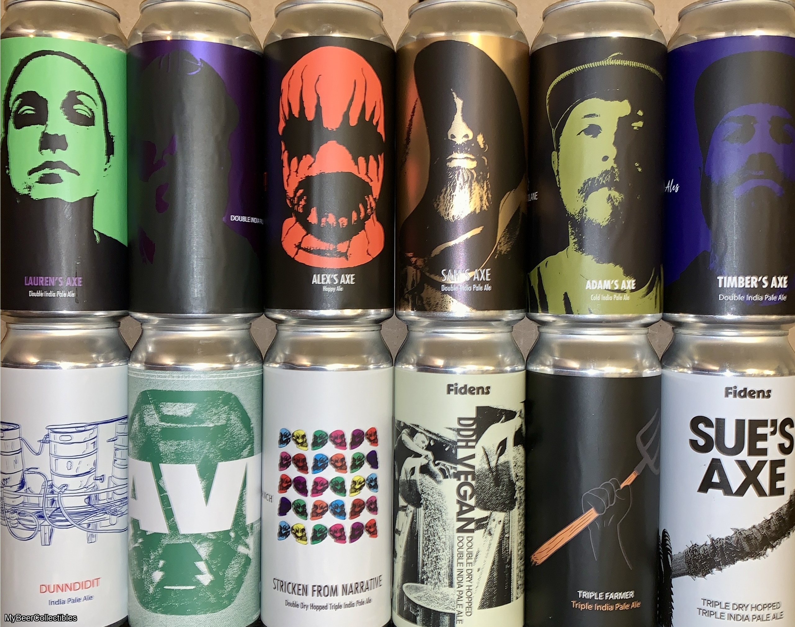 Twelve different Fidens cans, featuring one each of Alex's Axe (collab w/ Troon), Lauren's Axe (collab w/ Tin Barn), Adam's Axe (collab w/ Wayward Lane), Rossi's Axe (collab w/ Mortalis), Timber's Axe (collab w/ Timber Ales), DDH Sam’s Axe (collab w/ Brujos), Sue’s Axe (collab w/ Topplong Goliath), Stricken From The Narrative (collab w/ Root + Branch), Dunndidit, Triple Farmer, DDH Vegan, David.