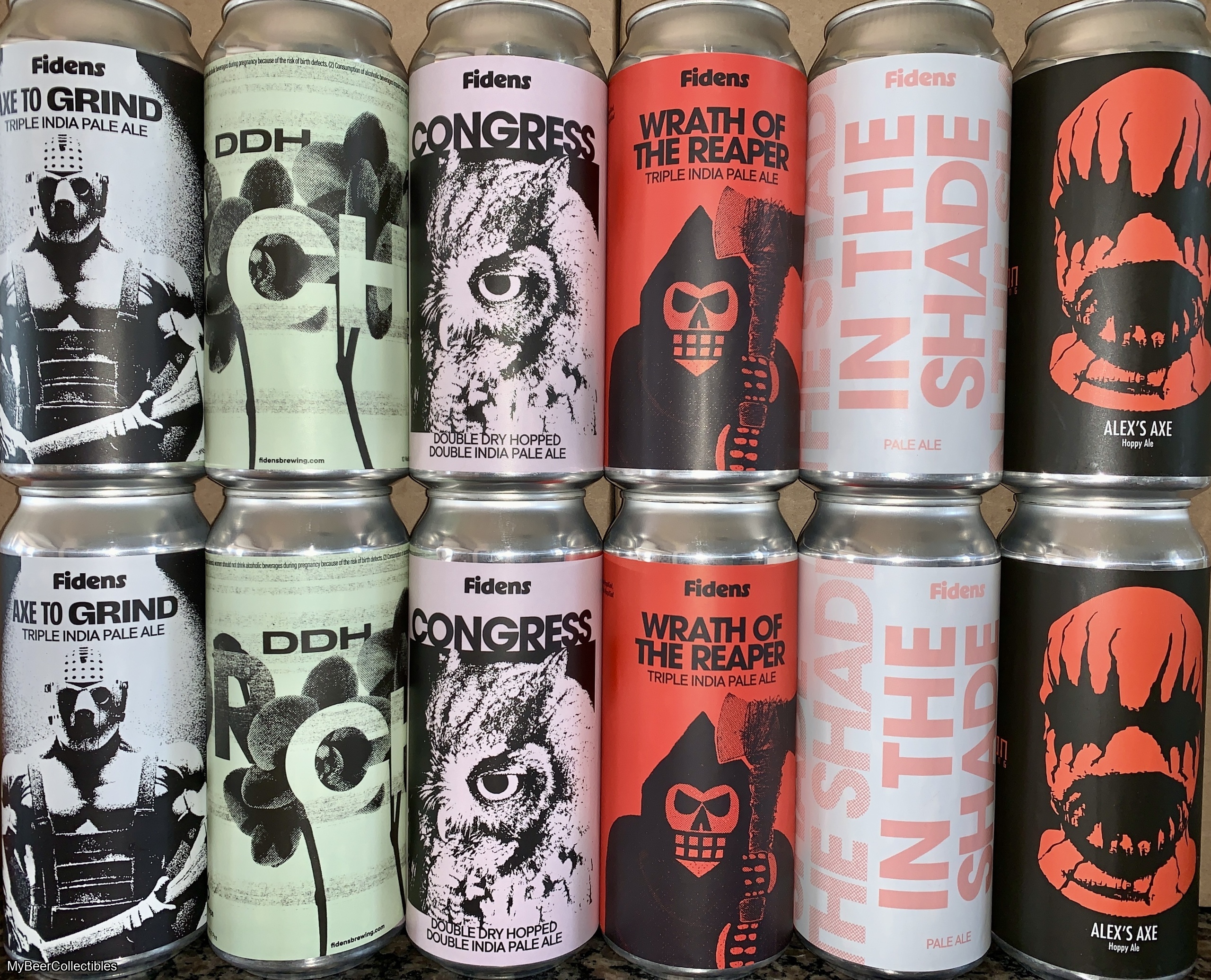 Twelve Fidens cans, featuring two each of Axe To Grind, DDH Orchid, Wrath Of The Reaper (collab w/ Messorem), Congress (collab w/ Troon & Wild Bird Research Group), In The Shade, Alex's Axe (collab w/ Troon).