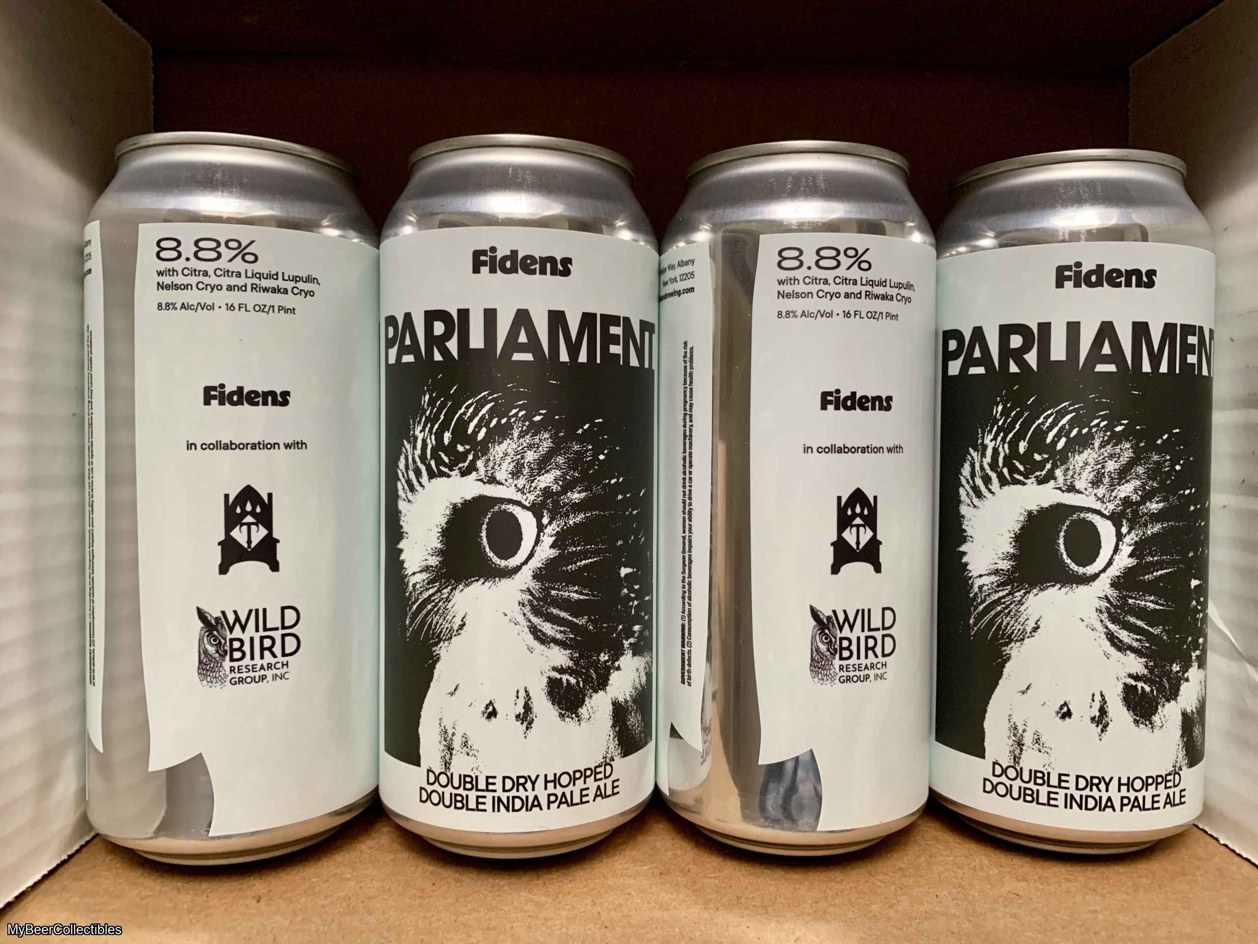 Four Parliament cans from Fidens x Troon x Wild Bird Research Group.
