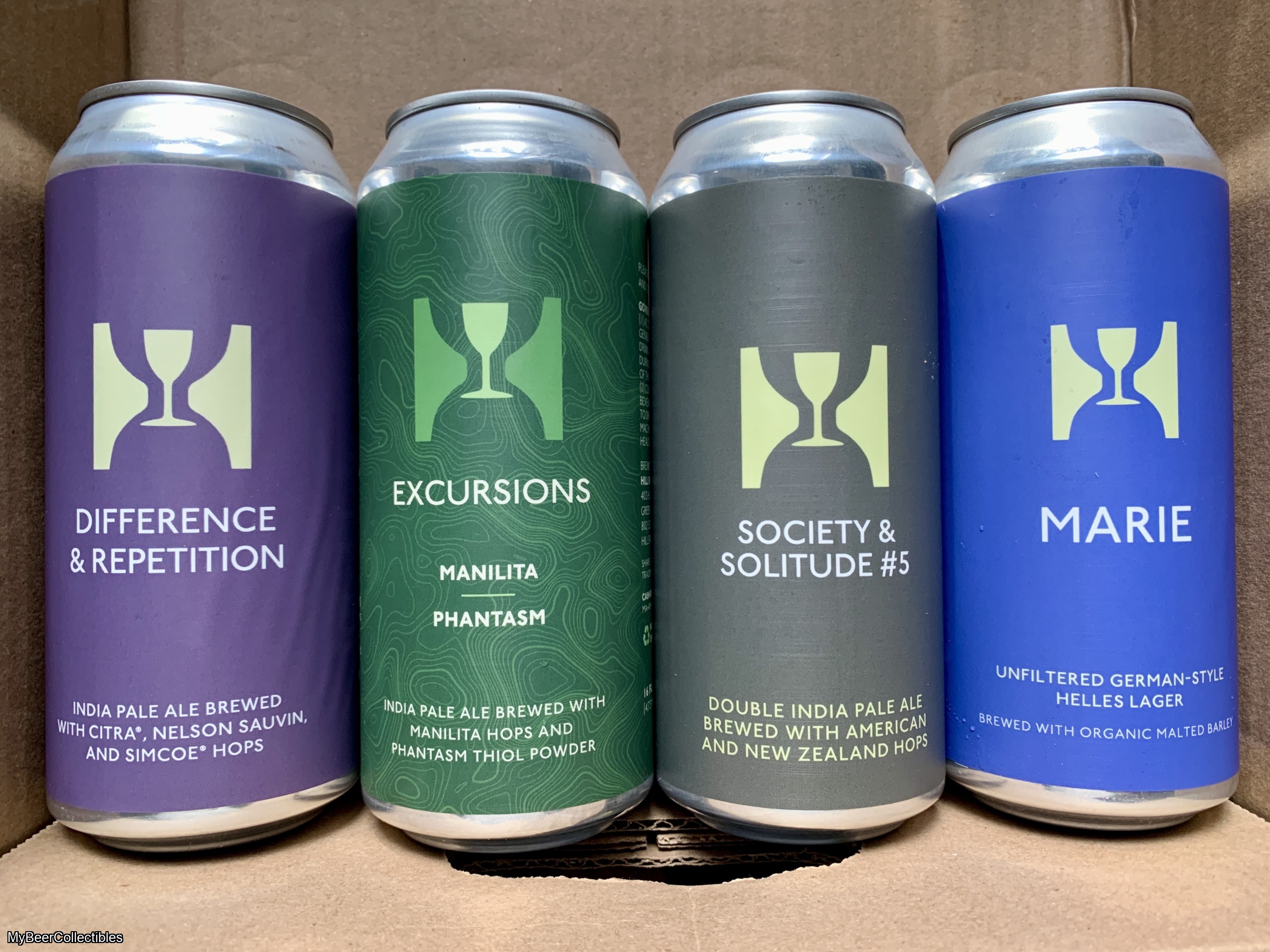 Four different Hill Farmstead cans, featuring one each of Society & Solitude #5, Excursions Manilita / Phantasm, Difference & Repetition, Marie.