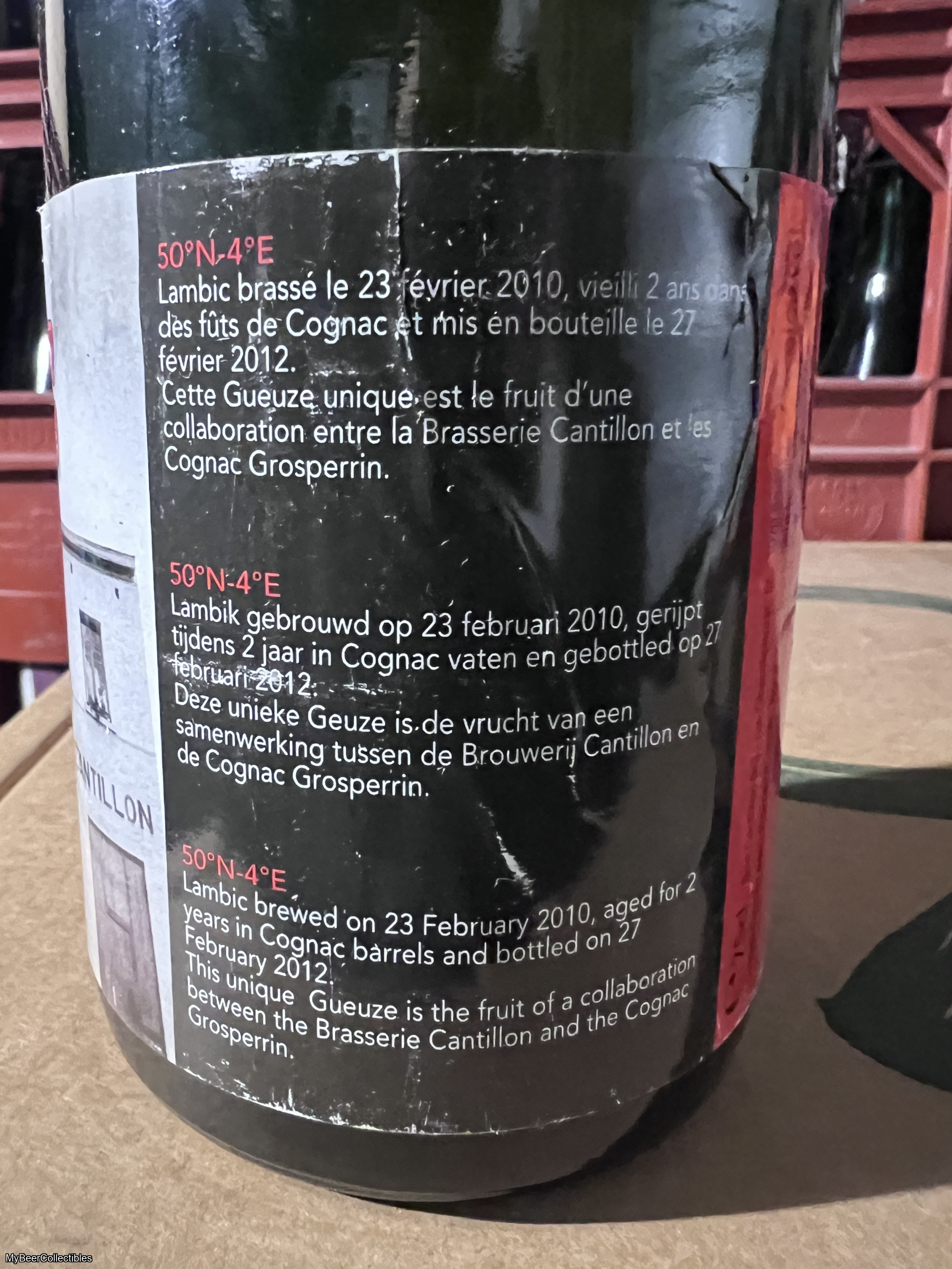 The second batch was bottled in February 2012 and released in 2013, the week following Tour De Gueuze. The label notes that the second batch was aged in barrels from Grosperrin Cognac.