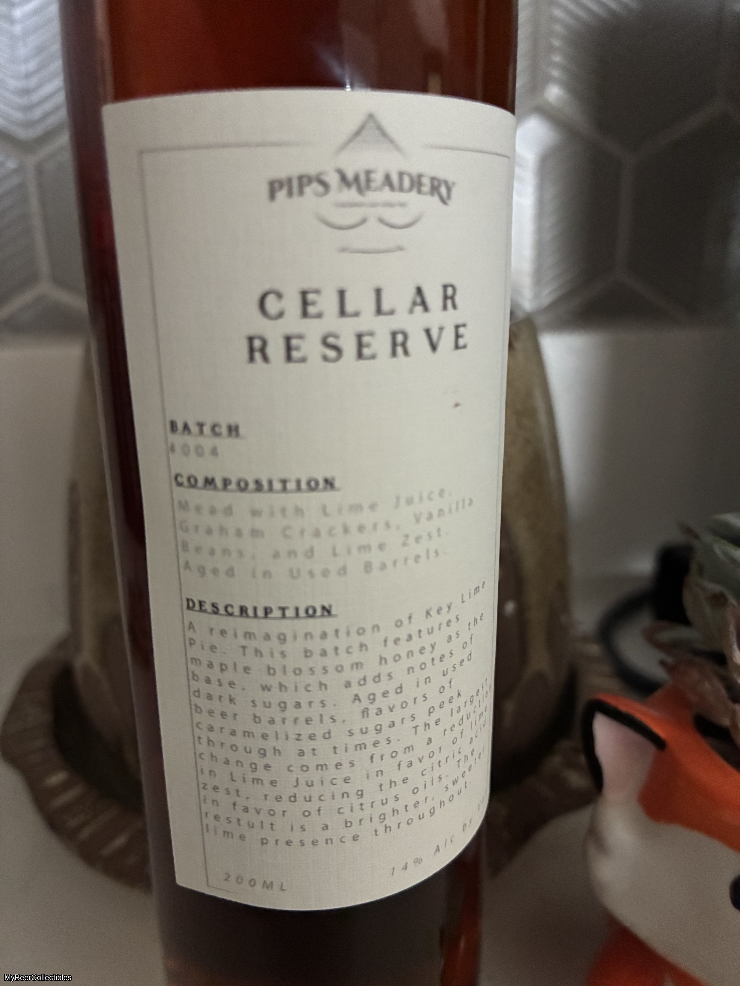 Cellar Reserve 004 is a re-imagination of Key Lime Pie. This batch features maple blossom honey as the base, which adds notes of dark sugars. Aged in used beer barrels, flavors of caramelized sugars peek through at times. The largest change comes from a reduction in Lime Juice in favor of lime zest, reducing the citric acid in favor of citrus oils. The result is a brighter, sweeter lime presence throughout. Whipped cream and toasted biscuit trail in the finish compliments of the vanilla and grah...
