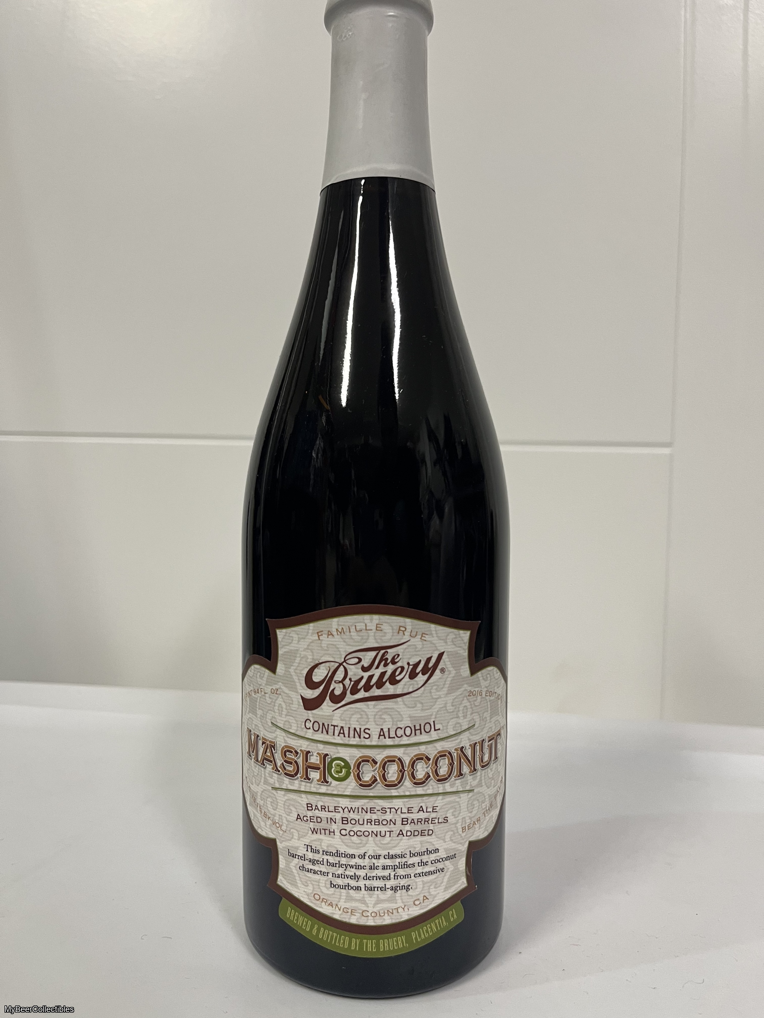 For sale from The Bruery in Placentia, CA is One (1) properly stored, unopened bottle of Mash & Coconut (2016 vintage). Bottle size 1 pt, 9.4 fl oz with 13.1% ABV.