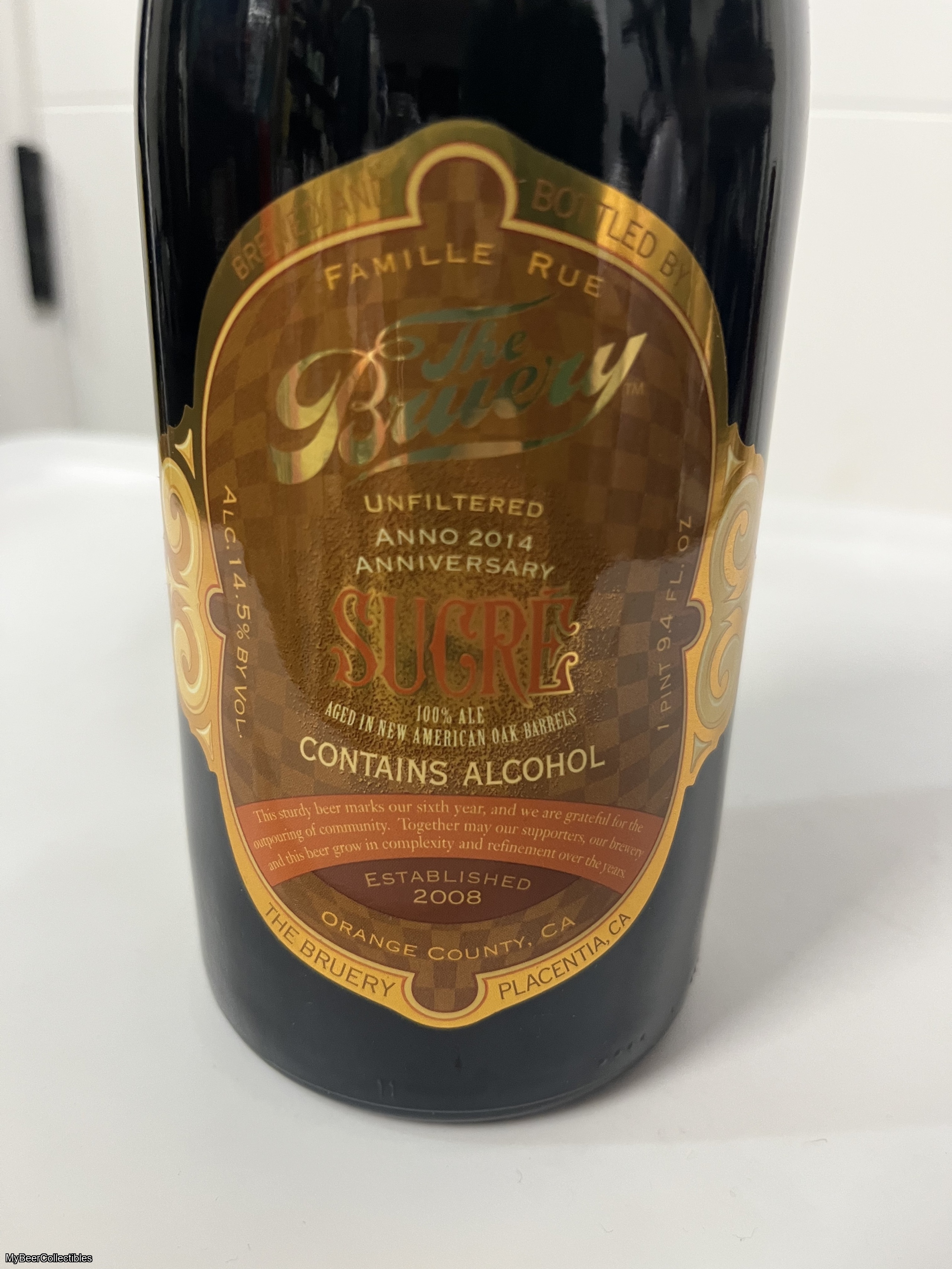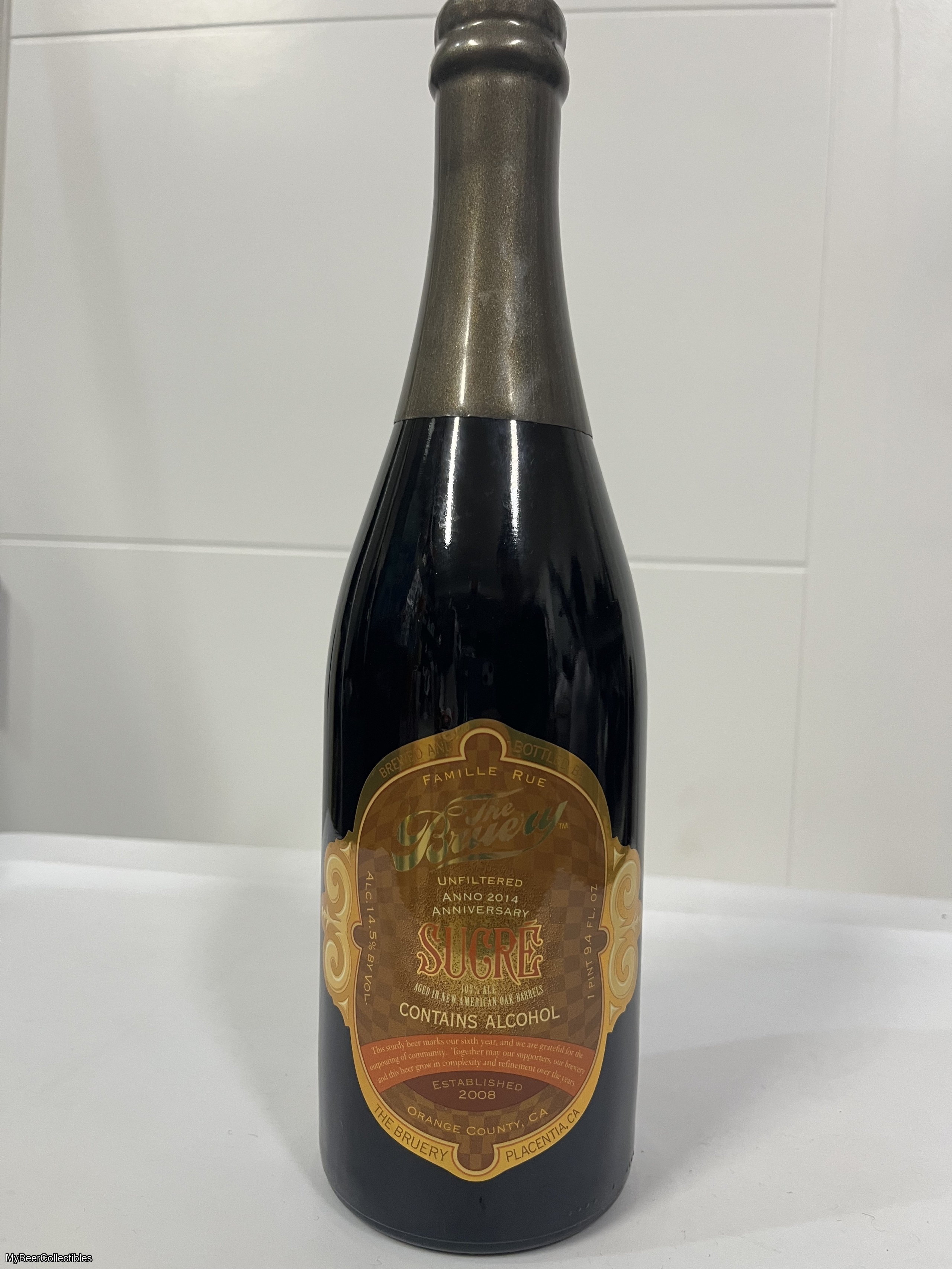 For sale from The Bruery in Placentia, CA is One (1) properly stored, unopened bottle of Sucre New American Oak Barrel Aged (2014 vintage). Bottle size 1 pt, 9.4 fl oz with 14.5% ABV.